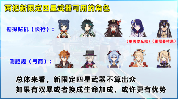 長槍方面,由于大多是輔助型角色,所以能用勘探鉆機(jī)的只有香菱、魈和胡桃等,并且香菱和胡桃都不算特別適配;至于賽諾和雷神,則更需要精通和充能。弓箭方面,我們不挑武器的 湯達(dá)人 公子自然能用,林尼、宵宮、甘雨也可以考慮用。不過個(gè)人認(rèn)為,這些角色本來就有相當(dāng)適配的專武和平替武器,加上新限定武器沒有雙暴,其實(shí)是有些尷尬的,說不定改為楓丹一貫的生命值副詞條和加成,還能擁有屬于自己的優(yōu)勢(shì)。
