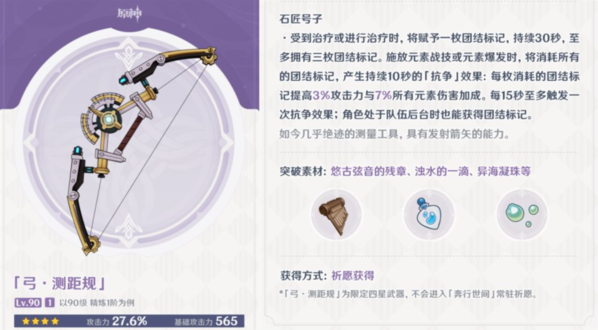 然后是兩把限定四星武器,因?yàn)槊姘搴吞匦酝耆恢戮头旁谝黄鹬v了??碧姐@機(jī)/測(cè)距規(guī):四星限定武器,分別是長槍和弓箭。滿級(jí)565白值加27.6%攻擊力。精1特性是受到或進(jìn)行治療時(shí),賦予一枚團(tuán)結(jié)標(biāo)記,最多擁有3枚;釋放戰(zhàn)技或大招時(shí)消耗所有標(biāo)記,獲得對(duì)應(yīng)的攻擊力和全元素加成。后臺(tái)也能獲得團(tuán)結(jié)標(biāo)記。