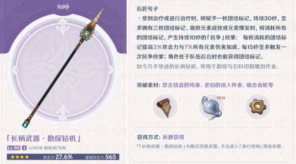如果按照疊滿3枚團(tuán)結(jié)標(biāo)記算,精1特性最多能提供9%攻擊力和21%全元素加成。再加上面板,相當(dāng)于總共提供565白值、36.6%攻擊力和21%全元素增傷。光看數(shù)值是挺不錯(cuò)的輸出武器,并且特性觸發(fā)不算難。缺點(diǎn)是每15秒才能觸發(fā)一次,以及沒有雙暴加成。