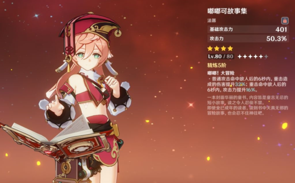 四星方面,匣里日月、嘟嘟可故事集、楓丹鍛造武器純水流華以及4.1活動(dòng)贈(zèng)送的無垠蔚藍(lán)之歌都有機(jī)會(huì)用得上,特別是嘟嘟可故事集,看這特性個(gè)人覺得它很有潛力成為萊歐斯利的 四星平替神器 。