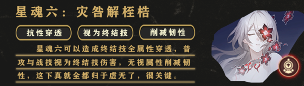 星魂六可以造成終結(jié)技全屬性穿透,普攻與戰(zhàn)技視為終結(jié)技傷害,無(wú)視屬性削減韌性,這下真就全都?xì)w于虛無(wú)了,很關(guān)鍵。