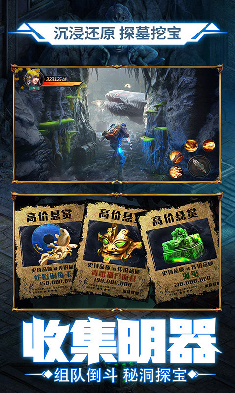 3、創(chuàng)新盜墓寶藏玩法,花一點(diǎn)點(diǎn)體力即可沉淀在3D打造的地下世界,摸金、探秘神秘的上古遺跡,金幣、銀幣、裝備掉落不停!