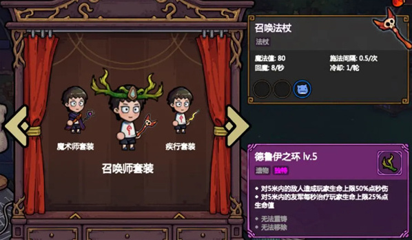 自帶召喚法杖和啵啵,隨套裝NPC一起解鎖,升級(jí)套裝會(huì)增強(qiáng)遺物德魯伊之環(huán)的范圍、傷害與治療量,同樣適合新手開荒與熟悉游戲。
