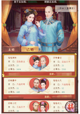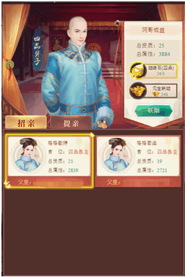 皇子封號(hào)越高,聯(lián)姻消耗的道具等級(jí)越高。成功聯(lián)姻后,親家子女的屬性值將加入到國(guó)力中,所以聯(lián)姻雙方實(shí)力是相當(dāng)重要的。
