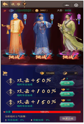 戰(zhàn)斗期間可以使用鼓舞或者元寶購(gòu)買臨時(shí)屬性,對(duì)于隨機(jī)到資質(zhì)高的玩家可以選擇元寶購(gòu)買。