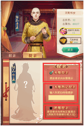 在龍鳳廳公開發(fā)布提親信息,等待同一服區(qū)的其他圣上看到提親信息后,選擇與圣上聯(lián)姻,這種方式會(huì)失去主動(dòng)挑選的權(quán)利,品級(jí)高的子女不建議采用這種方法。