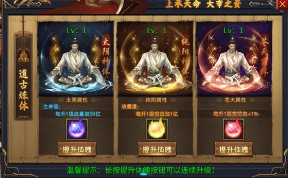 提升太陰、純陽、蒼天等屬性體魄,能分別增加生命、攻擊、防御等屬性。