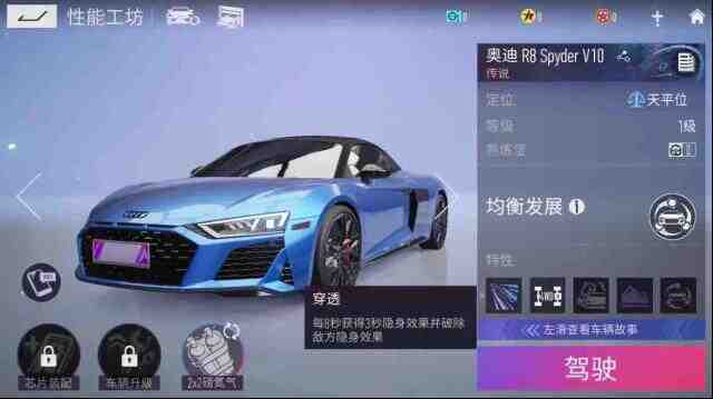 – 奧迪 R8 Spyder V10的被動特性-穿透:每8秒獲得3秒隱身效果并破除敵方隱身效果。