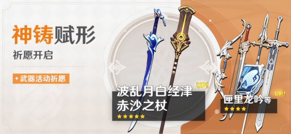 然后是武器池,四星里有三把西風,剩下的兩把是匣里龍吟以及流浪樂章。如果是剛?cè)肟拥拿刃?,這次武器池的四星還是不錯的;但如果是老玩家,這些常駐武器或許都已經(jīng)溢出了,所以相對來說吸引力沒那么強。不過這次武器池的重點是兩把五星專武,波亂劍和赤沙之杖不僅是好用的專武,而且還有一定的泛用性能給其他角色用;萬一歪了另一把也不算虧。