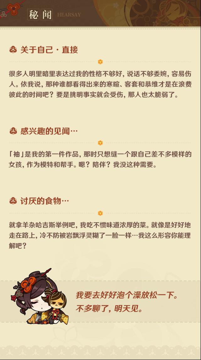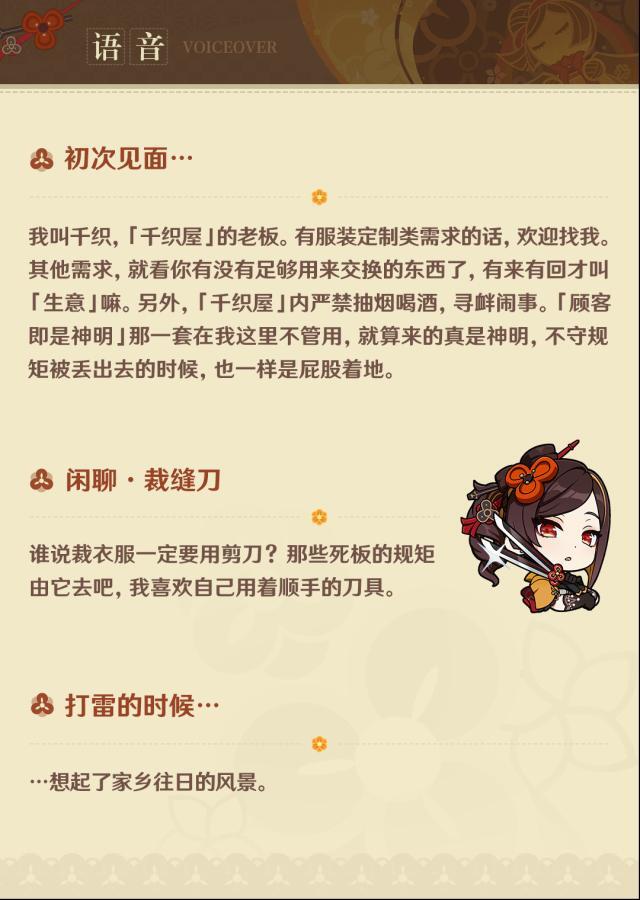 旅行者好呀!今天為大家介紹的角色是千織,她是「千織屋」的老板。楓丹著名服裝設(shè)計師。