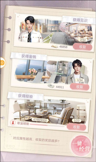 2、在一定時間內(nèi),集美能自動獲得1次經(jīng)營收益,收益會自動累計儲存,但是有次數(shù)限制,到達上限將停止收益累計,所以集美們要及時去經(jīng)營頁面收取收益哦。對了,職業(yè)等級/VIP等級越高,可累計的收益次數(shù)越高哦~