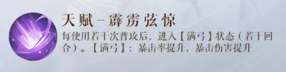 但如果你以為如鳶諸葛瑾只是一個(gè)靠技能暴力輸出的角色,那你就錯(cuò)了。他的天賦技能–“霹靂弦驚”,每使用若干次普攻后,他將進(jìn)入滿(mǎn)弓狀態(tài),這一狀態(tài)下,他的暴擊率和暴擊傷害都將得到顯著提升。這不僅僅是輸出上的增強(qiáng),更是讓他在短時(shí)間內(nèi)達(dá)成超高爆發(fā)的利器。而這個(gè)滿(mǎn)弓狀態(tài),一旦開(kāi)啟,無(wú)疑能給敵人帶來(lái)致命的打擊。