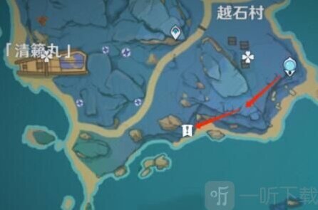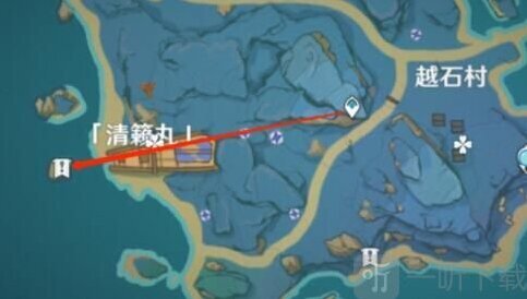 從越石村西側(cè)傳送錨點(diǎn)處向西抵達(dá)清籟丸地區(qū)之后的西側(cè)的一處沿岸的石板處,將拍攝視角轉(zhuǎn)向東方向即可: