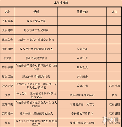 太陽(yáng)神技能屬于光火系。主要針對(duì)傷害提升、附屬傷害、范圍傷害、追蹤傷害,是每個(gè)大關(guān)卡提升實(shí)力的關(guān)鍵技能。