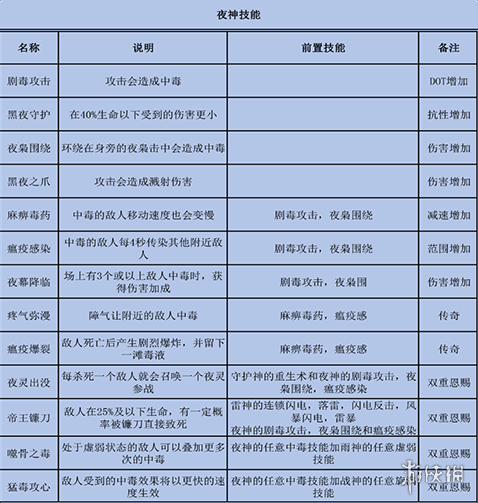 夜神技能具有毒系攻擊和濺射傷害的特點(diǎn)。其中,黑夜守護(hù)技能是低血量時(shí)的保命神技,非常實(shí)用。