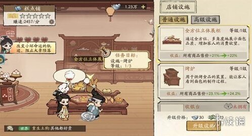 3、點(diǎn)擊設(shè)施選項(xiàng),可升級(jí)和解鎖店鋪內(nèi)的設(shè)施,提升設(shè)施等級(jí),能讓你的店鋪獲得更多收益。