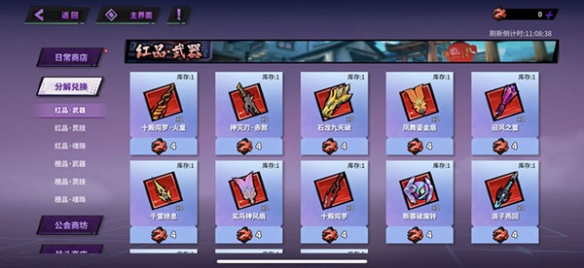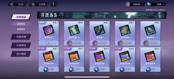 上面提到的資源商店只是黑市商店的一部分,其實黑市商店共分為4大塊,日常商店、分解兌換、公會商店以及戰(zhàn)斗商店,其中戰(zhàn)斗商店是后面玩法解鎖之后對應(yīng)的兌換商店,公會商店需加入公會才有,下面公會介紹會提到。