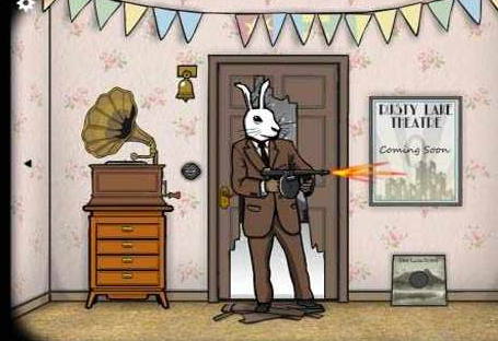 10、大門視角:窗外站在雪地上的兔子先生不見了,我們湊近貓眼一看,兔子先生來到了我們門前,我們后退幾步后兔子先生開始砸門,走進房間后拿著一把湯姆遜開始掃射,房間里一片狼藉。
