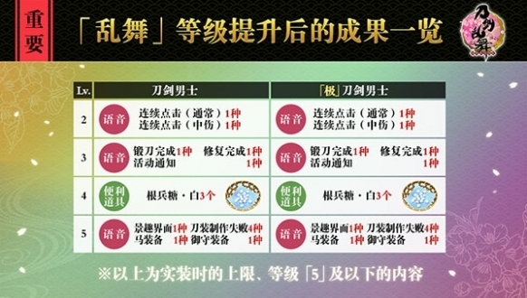 「亂舞」等級與現(xiàn)有的「刀劍」等級不同,是能夠讓刀劍男士通過「習合」來提升的另外一種等級系統(tǒng)。