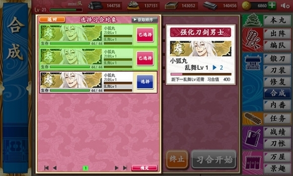通過「習合」使用相同的刀劍男士來提升「亂舞」等級。
