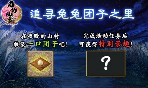 審神者在出陣時偶爾會發(fā)現(xiàn)兔子的蹤跡,通過擊敗敵人、追尋兔兔或擊破BOSS,有幾率獲得活動道具一口團子。對刀劍男士使用一口團子,能夠大幅恢復一位刀劍男士的疲勞度,并聽到全新的特別語音;完成活動任務對刀劍男士使用50個一口團子后,可以獲得中秋特別景趣。