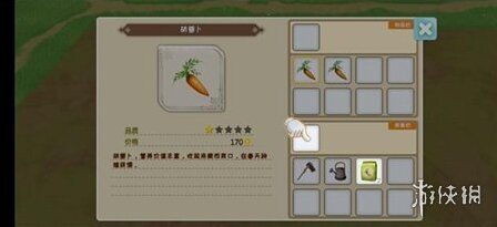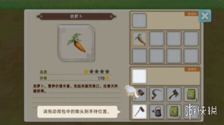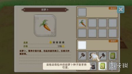 這里有個小技巧:第一天可以不用開墾農(nóng)田,等第二天賣掉胡蘿卜,用所得的錢剛好可以升級工具,把灑水壺升級一次后,一次就能澆三塊田,非常方便。