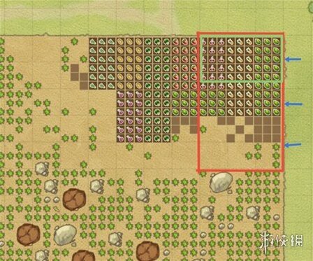 下圖紅色方框范圍即為一個秘銀壟,綠色方框為秘銀水壺最大蓄力的覆蓋范圍,在藍色箭頭位置進行三次最大蓄力澆灌即可完全覆蓋,秘銀壟共135格,秘銀水壺容量為300,因此一壺水可以澆灌兩個秘銀壟。