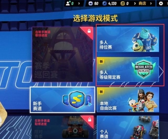 2、跳轉(zhuǎn)至游戲模式選擇界面,該界面提供多人排位賽、多人等級限定賽、本地自由比賽、個人賽道及新手賽道等多種模式選擇,此處以新手賽道模式為例進(jìn)行說明。