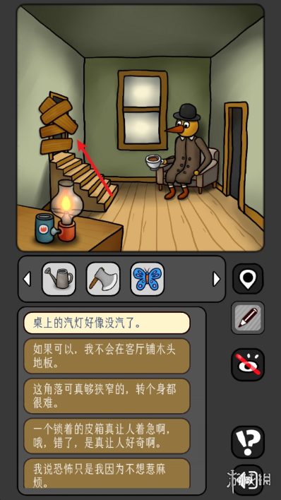 6、再次來到地下室,找到角落處的行李箱,用之前獲取的鑰匙將其打開,從中獲得斧頭和汽油。同時(shí),留意紙條上的箭頭以及紙張折角的位置信息:左上 – 下、右上 – 左、中 – 上、左下 – 左、右下 – 右。